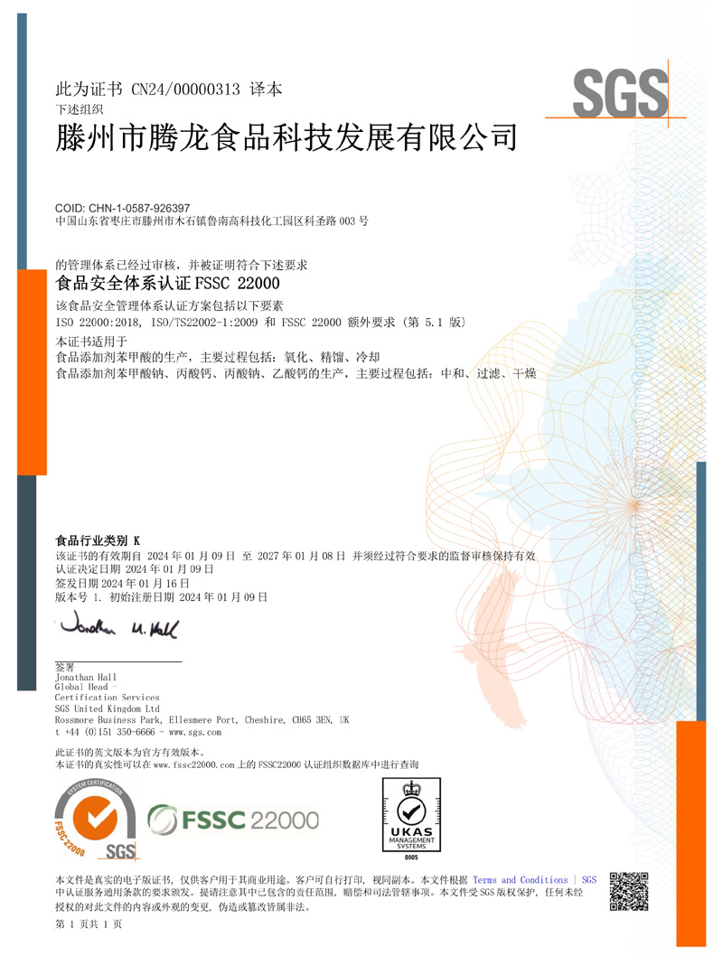 滕州市騰龍食品科技發(fā)展有限公司坐落在山東省滕州市木石鎮(zhèn)魯南高科技化工園區(qū),成立于1996年,前身是滕州市騰龍化工有限責(zé)任公司,公司專(zhuān)業(yè)生產(chǎn) 苯甲酸,苯甲酸鈉,丙酸鈣,丙酸鈉和醋酸鈣等系列產(chǎn)品。